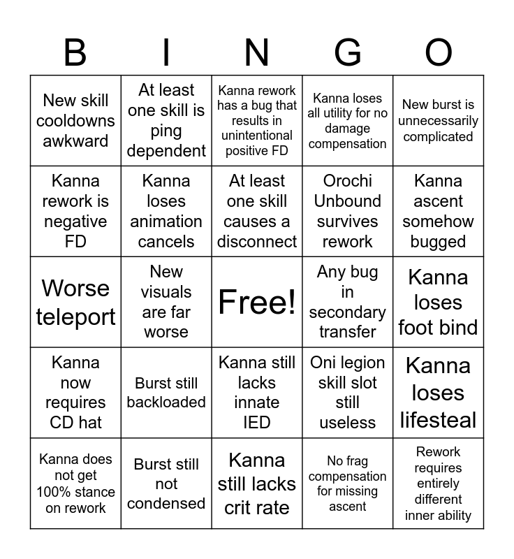 This bingo card has a free space and 24 words: Burst still backloaded, Burst still not condensed, At least one skill causes a disconnect, Kanna does not get 100% stance on rework, New burst is unnecessarily complicated, New skill cooldowns awkward, Kanna rework is negative FD, At least one skill is ping dependent, Any bug in secondary transfer, Kanna still lacks innate IED, Orochi Unbound survives rework, Worse teleport, Oni legion skill slot still useless, Kanna loses lifesteal, Kanna loses animation cancels, No frag compensation for missing ascent, Kanna loses foot bind, Kanna rework has a bug that results in unintentional positive FD, Kanna ascent somehow bugged, New visuals are far worse, Rework requires entirely different inner ability, Kanna now requires CD hat, Kanna loses all utility for no damage compensation and Kanna still lacks crit rate.