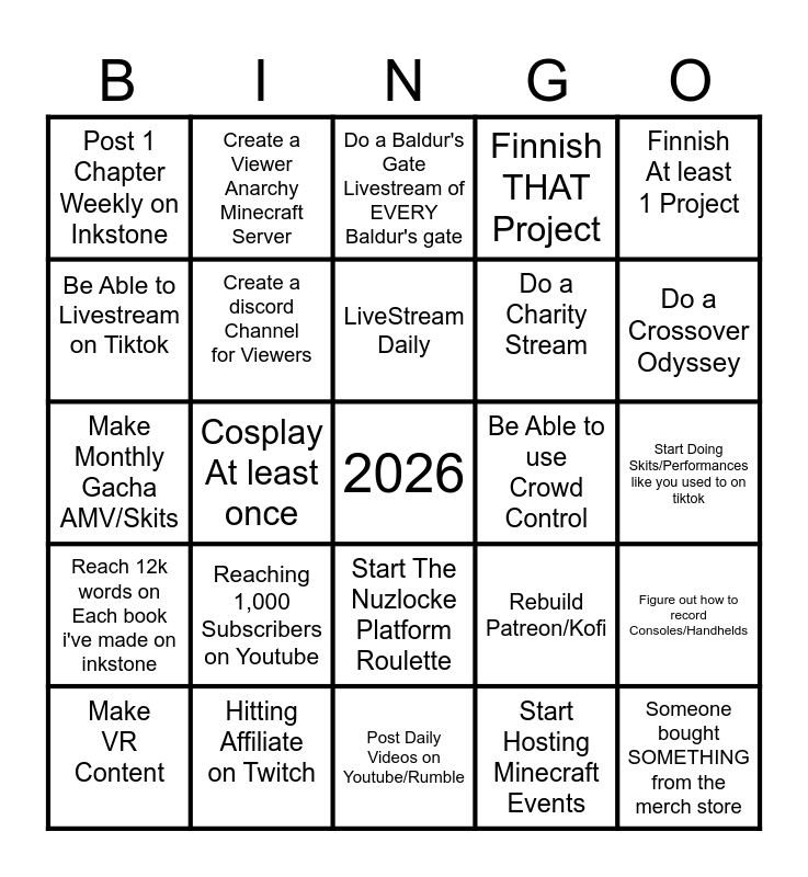 This bingo card has a free space and 24 words: Reaching 1,000 Subscribers on Youtube, Hitting Affiliate on Twitch, LiveStream Daily, Make VR Content, Finnish At least 1 Project, Post 1 Chapter Weekly on Inkstone, Be Able to Livestream on Tiktok, Create a Viewer Anarchy Minecraft Server, Be Able to use Crowd Control, Start The Nuzlocke Platform Roulette, Do a Charity Stream, Make Monthly Gacha AMV/Skits, Rebuild Patreon/Kofi, Figure out how to record Consoles/Handhelds, Create a discord Channel for Viewers, Start Hosting Minecraft Events, Start Doing Skits/Performances like you used to on tiktok, Do a Baldur's Gate Livestream of EVERY Baldur's gate, Do a Crossover Odyssey, Cosplay At least once, Someone bought SOMETHING from the merch store, Reach 12k words on Each book i've made on inkstone, Finnish THAT Project and Post Daily Videos on Youtube/Rumble.