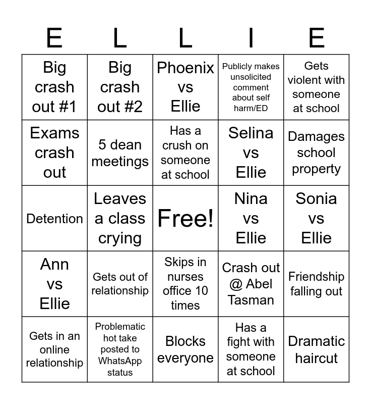 This bingo card has a free space and 24 words: Gets in an online relationship, Gets out of relationship, Has a crush on someone at school, Has a fight with someone at school, Gets violent with someone at school, Big crash out #1, Big crash out #2, Phoenix vs Ellie, Nina vs Ellie, Sonia vs Ellie, Detention, 5 dean meetings, Crash out @ Abel Tasman, Friendship falling out, Exams crash out, Problematic hot take posted to WhatsApp status, Blocks everyone, Publicly makes unsolicited comment about self harm/ED, Damages school property, Ann vs Ellie, Leaves a class crying, Skips in nurses office 10 times, Selina vs Ellie and Dramatic haircut.