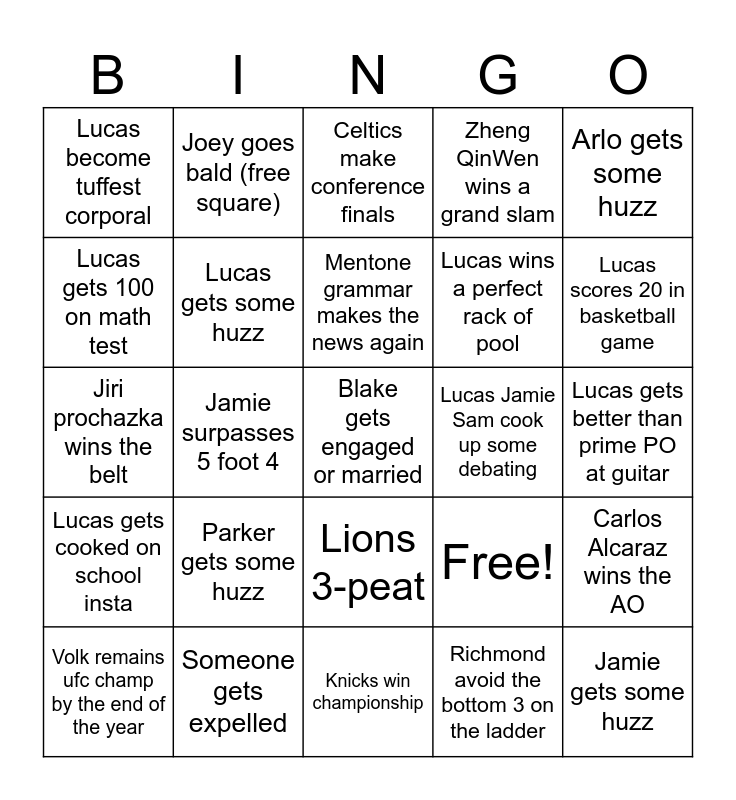 This bingo card has 25 words: Parker gets some huzz, Knicks win championship, Mentone grammar makes the news again, Volk remains ufc champ by the end of the year, Arlo gets some huzz, Lucas become tuffest corporal, Lucas gets 100 on math test, Joey goes bald (free square), Lucas Jamie Sam cook up some debating, Lions 3-peat, Lucas wins a perfect rack of pool, Jiri prochazka wins the belt, Free!, Carlos Alcaraz wins the AO, Lucas gets some huzz, Jamie gets some huzz, Lucas gets better than prime PO at guitar, Celtics make conference finals, Lucas scores 20 in basketball game, Jamie surpasses 5 foot 4, Blake gets engaged or married, Someone gets expelled, Lucas gets cooked on school insta, Zheng QinWen wins a grand slam and Richmond avoid the bottom 3 on the ladder.
