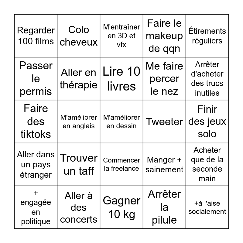 This bingo card has 25 words: Trouver un taff, Gagner 10 kg, Lire 10 livres, + engagée en politique, Étirements réguliers, Regarder 100 films, Passer le permis, Colo cheveux, Tweeter, Commencer la freelance, Me faire percer le nez, Faire des tiktoks, Manger + sainement, Acheter que de la seconde main, Aller en thérapie, +à l'aise socialement, Finir des jeux solo, M'entraîner en 3D et vfx, Arrêter d'acheter des trucs inutiles, M'améliorer en anglais, M'améliorer en dessin, Aller à des concerts, Aller dans un pays étranger, Faire le makeup de qqn and Arrêter la pilule.