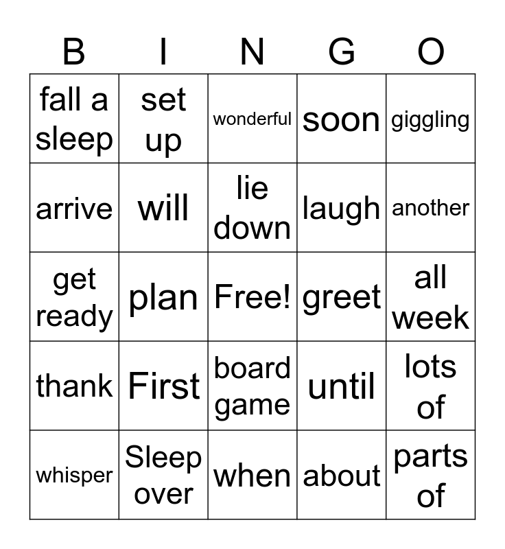 This bingo card has a free space and 24 words: First, Sleep over, lie down, whisper, giggling, fall a sleep, arrive, set up, greet, board game, laugh, get ready, until, lots of, will, about, all week, wonderful, another, plan, parts of, thank, soon and when.