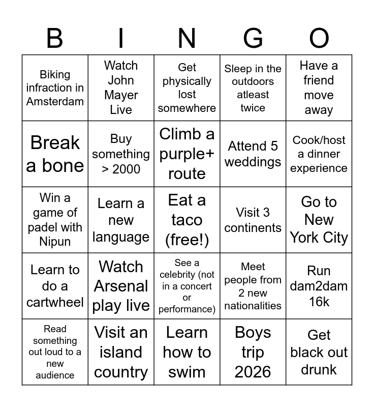 This bingo card has a free space and 24 words: Watch Arsenal play live, Visit an island country, Climb a purple+ route, Read something out loud to a new audience, Have a friend move away, Biking infraction in Amsterdam, Break a bone, Watch John Mayer Live, Visit 3 continents, See a celebrity (not in a concert or performance), Attend 5 weddings, Win a game of padel with Nipun, Meet people from 2 new nationalities, Run dam2dam 16k, Buy something > 2000, Boys trip 2026, Go to New York City, Get physically lost somewhere, Cook/host a dinner experience, Learn a new language, Get black out drunk, Learn to do a cartwheel, Sleep in the outdoors atleast twice and Learn how to swim.