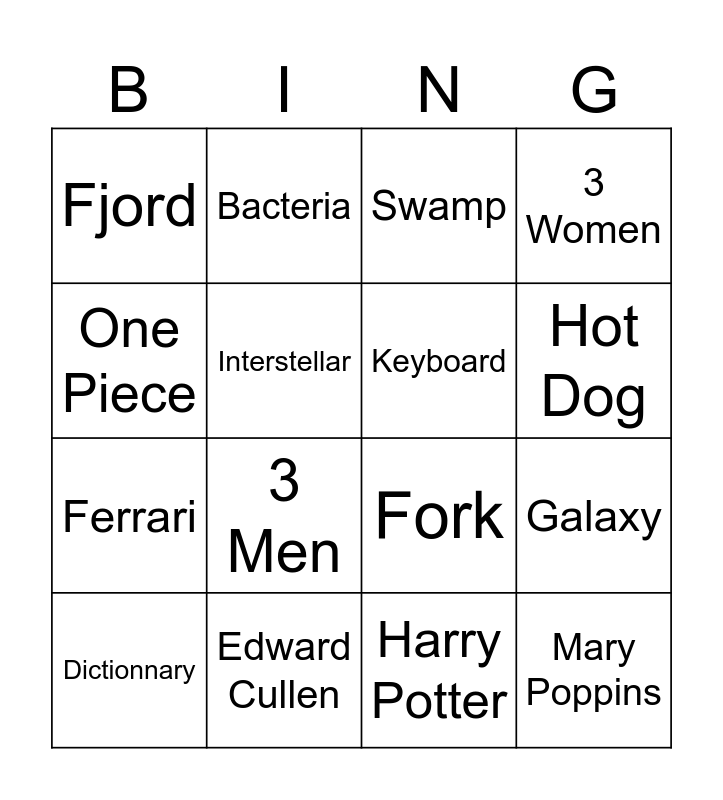 This bingo card has 16 words: Edward Cullen, Galaxy, Swamp, Fjord, Ferrari, Bacteria, Fork, Harry Potter, One Piece, Interstellar, Dictionnary, 3 Women, 3 Men, Hot Dog, Keyboard and Mary Poppins.