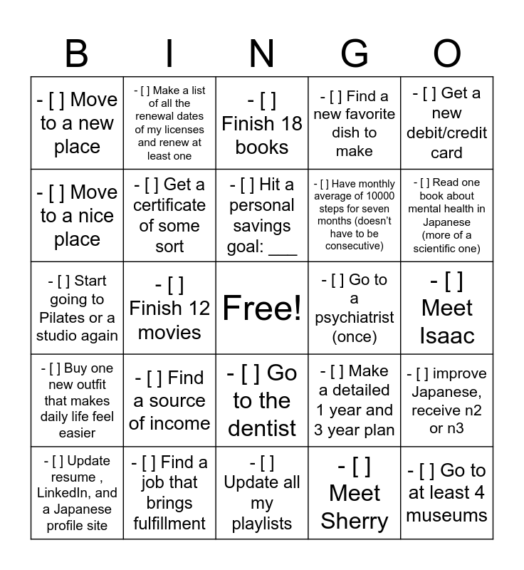 This bingo card has a free space and 24 words: - [ ] Find a source of income, - [ ] Find a job that brings fulfillment, - [ ] Hit a personal savings goal: ___, - [ ] Update resume , LinkedIn, and a Japanese profile site, - [ ] Get a new debit/credit card, - [ ] Move to a new place, - [ ] Move to a nice place, - [ ] Make a list of all the renewal dates of my licenses and renew at least one, - [ ] Go to a psychiatrist (once), - [ ] Go to the dentist, - [ ] Have monthly average of 10000 steps for seven months (doesn’t have to be consecutive), - [ ] Start going to Pilates or a studio again, - [ ] Make a detailed 1 year and 3 year plan, - [ ] improve Japanese, receive n2 or n3, - [ ] Get a certificate of some sort, - [ ] Meet Sherry, - [ ] Meet Isaac, - [ ] Finish 18 books, - [ ] Read one book about mental health in Japanese (more of a scientific one), - [ ] Finish 12 movies, - [ ] Go to at least 4 museums, - [ ] Buy one new outfit that makes daily life feel easier, - [ ] Find a new favorite dish to make and - [ ] Update all my playlists.