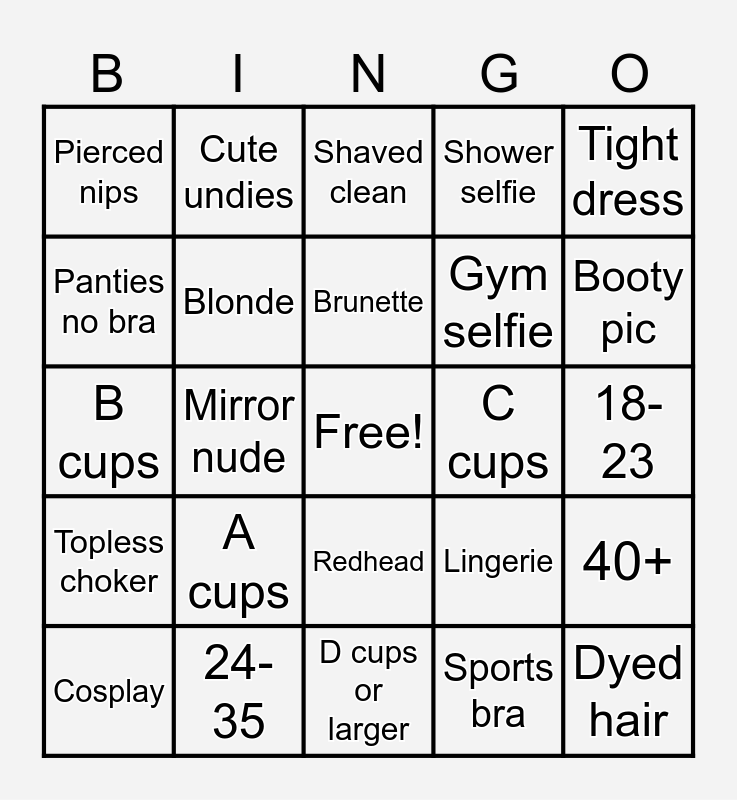 This bingo card has a free space and 24 words: A cups, 24-35, Brunette, Cosplay, Tight dress, Pierced nips, Panties no bra, Cute undies, C cups, Redhead, Gym selfie, B cups, Lingerie, 40+, Blonde, Sports bra, 18-23, Shaved clean, Booty pic, Mirror nude, Dyed hair, Topless choker, Shower selfie and D cups or larger.