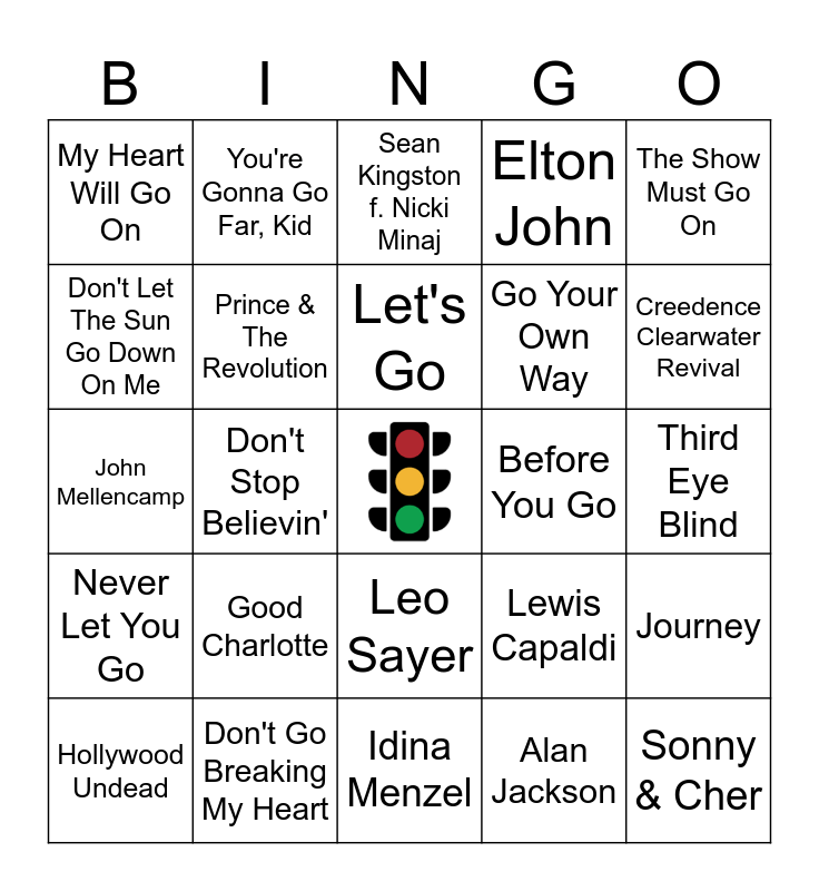 This bingo card has a free space and 95 words: 3 Doors Down, Let Me Go, Alan Jackson, Long Way To Go, Andrew W.K., Don't Stop Livin' In The Red, Backstreet Boys, Don't Go Breaking My Heart, Bon Jovi f. Jennifer Nettles, Who Says You Can't Go Home, Bryan Adams, Can't Stop This Thing We Started, Calvin Harris f. Ne-Yo, Let's Go, Celine Dion, My Heart Will Go On, Creedence Clearwater Revival, Who'll Stop The Rain, Daryl Hall & John Oates, I Can't Go For That (No Can Do), Dirty Vegas, Days Go By, Drake f. Majid Jordan, Hold On, We’re Going Home, Elton John, Don't Let The Sun Go Down On Me, Fleetwood Mac, Go Your Own Way, Fort Minor f. Holly Brook & Jonah Matranga, Where'd You Go, Good Charlotte, I Don't Wanna Stop, Grouplove, Ways To Go, Hollywood Undead, Everywhere I Go, Idina Menzel, Let It Go, John Mellencamp, Baby, Please Don't Go, Journey, Don't Stop Believin', Leo Sayer, The Show Must Go On, Lewis Capaldi, Before You Go, Michael Jackson, Don’t Stop 'Til You Get Enough, Miley Cyrus, We Can't Stop, No Mercy, Where Do You Go, OK Go, Here It Goes Again, Passenger, Let Her Go, Pitbull f. TJR, Don't Stop The Party, Post Malone, Go Flex, Prince & The Revolution, Let's Go Crazy, Richie Valens, Come On, Let's Go, Rob Zombie, Never Gonna Stop (The Red, Red Kroovy), S Club 7, Don't Stop Movin', Sean Kingston f. Nicki Minaj, Letting Go (Dutty Love), Sia, Unstoppable, Sonny & Cher, Baby Don't Go, Tech N9ne f. 2 Chainz & B.o.B., Hood Go Crazy, The Clash, Should I Stay Or Should I Go, The Offspring, You're Gonna Go Far, Kid, The Rolling Stones, Don't Stop, The Supremes, Stop! In The Name Of Love, Third Eye Blind, Never Let You Go, Travis Barker f. Yelawolf, Twista, Busta Rhymes, & Lil Jon, Usher, There Goes My Baby, Weird Al Yankovic, Stop Draggin' My Car Around, Whitesnake, Here I Go Again, Whitney Houston and Where Do Broken Hearts Go.