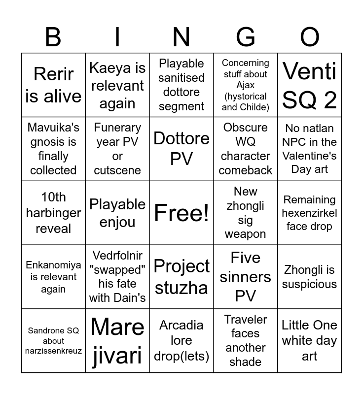 This bingo card has a free space and 24 words: Vedrfolnir "swapped" his fate with Dain's, Mare jivari, Dottore PV, Sandrone SQ about narzissenkreuz, Venti SQ 2, Rerir is alive, Mavuika's gnosis is finally collected, Kaeya is relevant again, New zhongli sig weapon, Project stuzha, Obscure WQ character comeback, 10th harbinger reveal, Five sinners PV, Zhongli is suspicious, Funerary year PV or cutscene, Traveler faces another shade, Remaining hexenzirkel face drop, Playable sanitised dottore segment, No natlan NPC in the Valentine's Day art, Playable enjou, Little One white day art, Enkanomiya is relevant again, Concerning stuff about Ajax (hystorical and Childe) and Arcadia lore drop(lets).