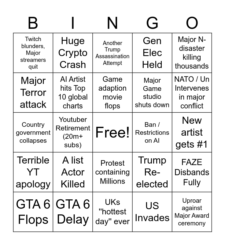 This bingo card has a free space and 24 words: A list Actor Killed, GTA 6 Delay, Game adaption movie flops, GTA 6 Flops, Major N-disaster killing thousands, Twitch blunders, Major streamers quit, Major Terror attack, Huge Crypto Crash, Ban / Restrictions on AI, Protest containing Millions, Major Game studio shuts down, Country government collapses, Trump Re-elected, FAZE Disbands Fully, AI Artist hits Top 10 global charts, US Invades, New artist gets #1, Another Trump Assassination Attempt, NATO / Un Intervenes in major conflict, Youtuber Retirement (20m+ subs), Uproar against Major Award ceremony, Terrible YT apology, Gen Elec Held and UKs ''hottest day'' ever.
