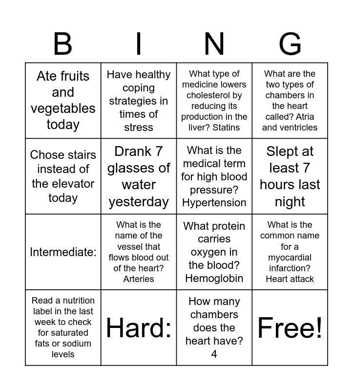 This bingo card has 23 words: Free!, Walked at least 10,000 steps today, Slept at least 7 hours last night, Checked your blood pressure in the last year, Chose stairs instead of the elevator today, Ate fruits and vegetables today, Drank 7 glasses of water yesterday, Have healthy coping strategies in times of stress, Read a nutrition label in the last week to check for saturated fats or sodium levels, Which organ pumps blood through the body? The heart, What is the name of the vessel that flows blood out of the heart? Arteries, Intermediate:, What is considered a healthy blood pressure? Under 120/80 mmHg, What mineral in bananas helps cardiovascular health? Potassium, Hard:, What type of fat should be avoided for good cardiovascular health? Trans fat, What type of medicine lowers cholesterol by reducing its production in the liver? Statins, What protein carries oxygen in the blood? Hemoglobin, What is the medical term for high blood pressure? Hypertension, What is the common name for a myocardial infarction? Heart attack, What are the two types of chambers in the heart called? Atria and ventricles, How many chambers does the heart have? 4 and What life-saving technique is used for someone when their heart has stopped? CPR.