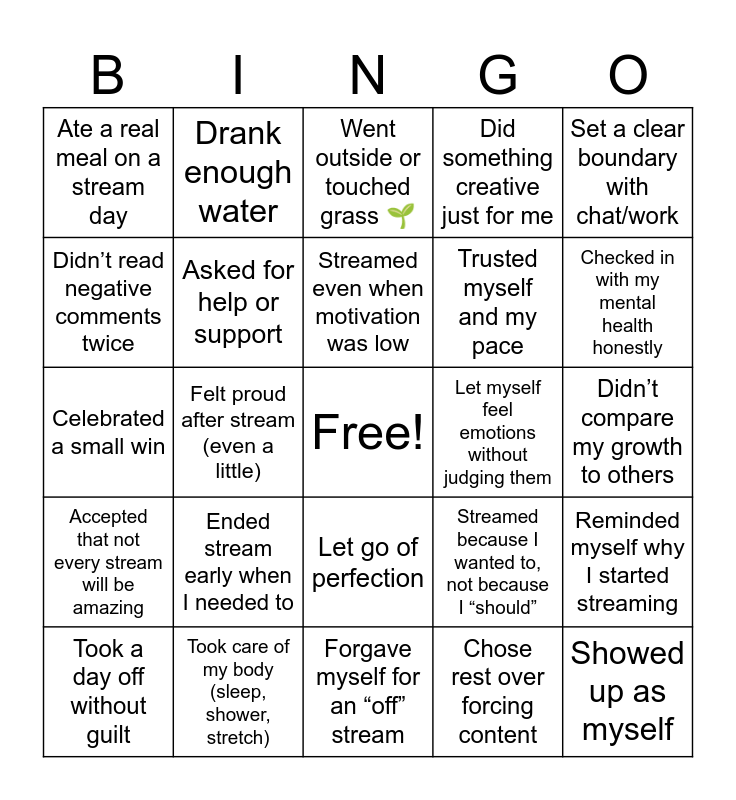 This bingo card has a free space and 24 words: Took a day off without guilt, Ended stream early when I needed to, Streamed even when motivation was low, Chose rest over forcing content, Set a clear boundary with chat/work, Ate a real meal on a stream day, Drank enough water, Went outside or touched grass 🌱, Let myself feel emotions without judging them, Didn’t compare my growth to others, Celebrated a small win, Asked for help or support, Streamed because I wanted to, not because I “should”, Reminded myself why I started streaming, Didn’t read negative comments twice, Took care of my body (sleep, shower, stretch), Forgave myself for an “off” stream, Did something creative just for me, Checked in with my mental health honestly, Accepted that not every stream will be amazing, Felt proud after stream (even a little), Let go of perfection, Trusted myself and my pace and Showed up as myself.