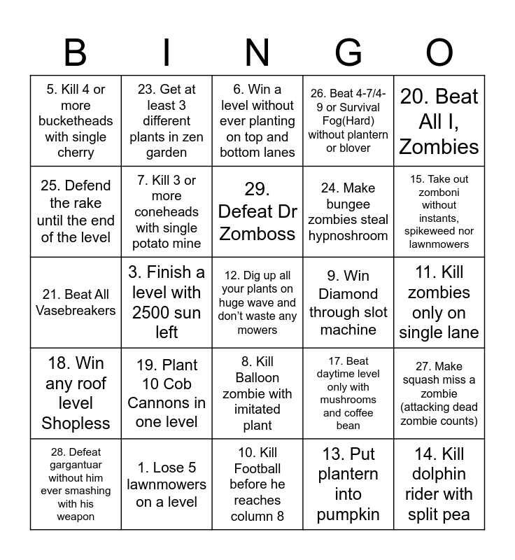 This bingo card has 30 words: 1. Lose 5 lawnmowers on a level, 2. Use only first 2 columns to win, 3. Finish a level with 2500 sun left, 4. Beat any normal level without sun producers, 5. Kill 4 or more bucketheads with single cherry, 6. Win a level without ever planting on top and bottom lanes, 7. Kill 3 or more coneheads with single potato mine, 8. Kill Balloon zombie with imitated plant, 9. Win Diamond through slot machine, 10. Kill Football before he reaches column 8, 11. Kill zombies only on single lane, 12. Dig up all your plants on huge wave and don’t waste any mowers, 13. Put plantern into pumpkin, 14. Kill dolphin rider with split pea, 15. Take out zomboni without instants, spikeweed nor lawnmowers, 16. Beat nighttime level without mushrooms, 17. Beat daytime level only with mushrooms and coffee bean, 18. Win any roof level Shopless, 19. Plant 10 Cob Cannons in one level, 20. Beat All I, Zombies, 21. Beat All Vasebreakers, 22. Complete at least 5 minigames, 23. Get at least 3 different plants in zen garden, 24. Make bungee zombies steal hypnoshroom, 25. Defend the rake until the end of the level, 26. Beat 4-7/4-9 or Survival Fog(Hard) without plantern or blover, 27. Make squash miss a zombie (attacking dead zombie counts), 28. Defeat gargantuar without him ever smashing with his weapon, 29. Defeat Dr Zomboss and 30. Beat Zombotany using 6 seed slots.