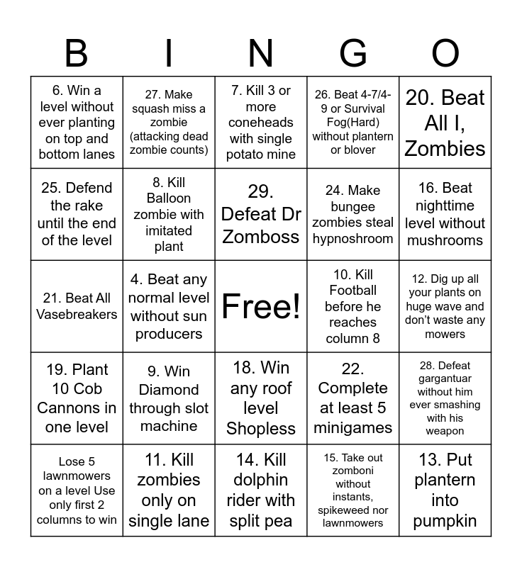 This bingo card has a free space and 29 words: Lose 5 lawnmowers on a level Use only first 2 columns to win, 3. Finish a level with 2500 sun left, 4. Beat any normal level without sun producers, 5. Kill 4 or more bucketheads with single cherry, 6. Win a level without ever planting on top and bottom lanes, 7. Kill 3 or more coneheads with single potato mine, 8. Kill Balloon zombie with imitated plant, 9. Win Diamond through slot machine, 10. Kill Football before he reaches column 8, 11. Kill zombies only on single lane, 12. Dig up all your plants on huge wave and don’t waste any mowers, 13. Put plantern into pumpkin, 14. Kill dolphin rider with split pea, 15. Take out zomboni without instants, spikeweed nor lawnmowers, 16. Beat nighttime level without mushrooms, 17. Beat daytime level only with mushrooms and coffee bean, 18. Win any roof level Shopless, 19. Plant 10 Cob Cannons in one level, 20. Beat All I, Zombies, 21. Beat All Vasebreakers, 22. Complete at least 5 minigames, 23. Get at least 3 different plants in zen garden, 24. Make bungee zombies steal hypnoshroom, 25. Defend the rake until the end of the level, 26. Beat 4-7/4-9 or Survival Fog(Hard) without plantern or blover, 27. Make squash miss a zombie (attacking dead zombie counts), 28. Defeat gargantuar without him ever smashing with his weapon, 29. Defeat Dr Zomboss and 30. Beat Zombotany using 6 seed slots.