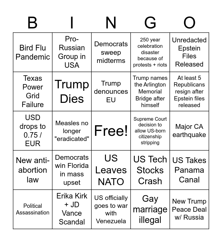 This bingo card has a free space and 24 words: Democrats win Florida in mass upset, Erika Kirk + JD Vance Scandal, Trump denounces EU, Political Assassination, Unredacted Epstein Files Released, Bird Flu Pandemic, Texas Power Grid Failure, Pro-Russian Group in USA, Supreme Court decision to allow US-born citizenship stripping, US Leaves NATO, Trump names the Arlington Memorial Bridge after himself, USD drops to 0.75 / EUR, US Tech Stocks Crash, US Takes Panama Canal, Trump Dies, Gay marriage illegal, Major CA earthquake, Democrats sweep midterms, At least 5 Republicans resign after Epstein files released, Measles no longer "eradicated", New Trump Peace Deal w/ Russia, New anti-abortion law, 250 year celebration disaster because of protests + riots and US officially goes to war with Venezuela.