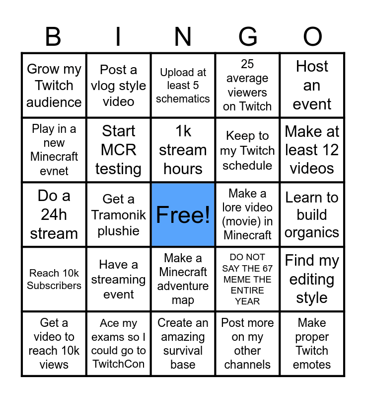 This bingo card has a free space and 24 words: Have a streaming event, Ace my exams so I could go to TwitchCon, 1k stream hours, Get a video to reach 10k views, Host an event, Grow my Twitch audience, Play in a new Minecraft evnet, Post a vlog style video, Make a lore video (movie) in Minecraft, Make a Minecraft adventure map, Keep to my Twitch schedule, Do a 24h stream, DO NOT SAY THE 67 MEME THE ENTIRE YEAR, Find my editing style, Start MCR testing, Post more on my other channels, Learn to build organics, Upload at least 5 schematics, Make at least 12 videos, Get a Tramonik plushie, Make proper Twitch emotes, Reach 10k Subscribers, 25 average viewers on Twitch and Create an amazing survival base.