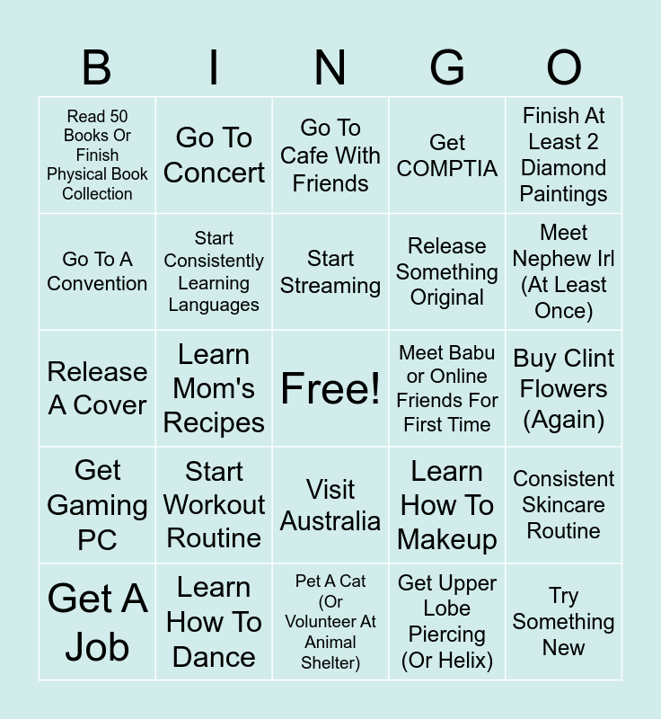 This bingo card has a free space and 24 words: Start Workout Routine, Learn How To Dance, Start Streaming, Get A Job, Finish At Least 2 Diamond Paintings, Read 50 Books Or Finish Physical Book Collection, Go To A Convention, Go To Concert, Meet Babu or Online Friends For First Time, Visit Australia, Release Something Original, Release A Cover, Learn How To Makeup, Consistent Skincare Routine, Start Consistently Learning Languages, Get Upper Lobe Piercing (Or Helix), Buy Clint Flowers (Again), Go To Cafe With Friends, Meet Nephew Irl (At Least Once), Learn Mom's Recipes, Try Something New, Get Gaming PC, Get COMPTIA and Pet A Cat (Or Volunteer At Animal Shelter).