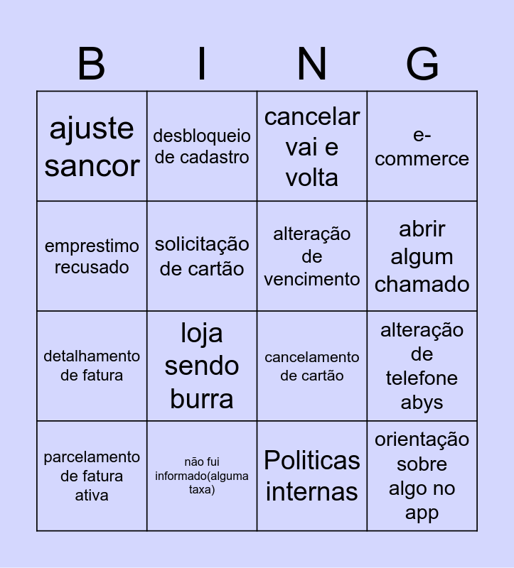 This bingo card has 16 words: não fui informado(alguma taxa), alteração de telefone abys, cancelar vai e volta, ajuste sancor, detalhamento de fatura, desbloqueio de cadastro, cancelamento de cartão, Politicas internas, emprestimo recusado, solicitação de cartão, parcelamento de fatura ativa, e-commerce, loja sendo burra, abrir algum chamado, alteração de vencimento and orientação sobre algo no app.
