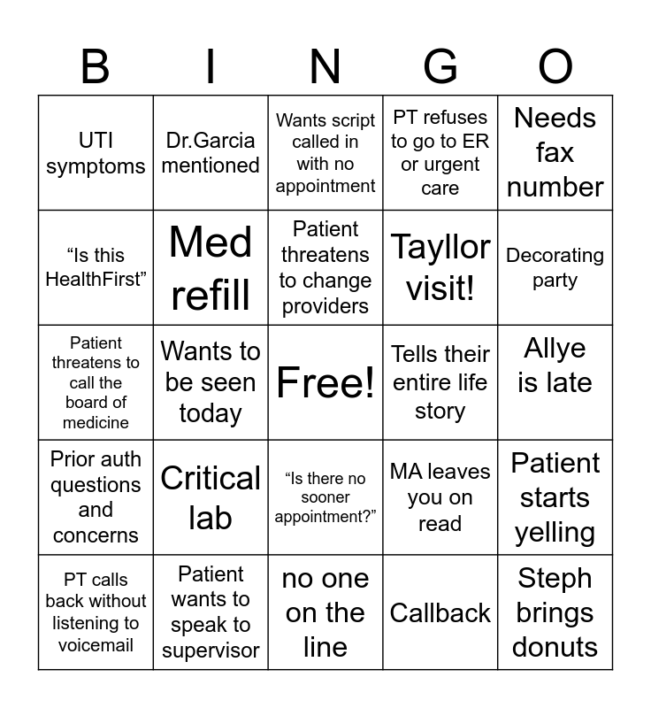 This bingo card has a free space and 31 words: no one on the line, “Why isn't my prescription ready yet?”, Wants to be seen today, New patient, UTI symptoms, Wants script called in with no appointment, Med refill, MA leaves you on read, Tells their entire life story, Callback, Allye is late, Steph brings donuts, Allye orders DoorDash, Rae orders DoorDash, Decorating party, Rae is absorbed in her kindle, Patient starts yelling, Critical lab, Prior auth questions and concerns, “Is there no sooner appointment?”, Needs fax number, Pharmacy needs clarification, PT calls back without listening to voicemail, Dr.Garcia mentioned, Tayllor visit!, “Is this HealthFirst”, PT refuses to go to ER or urgent care, Patient threatens to call the board of medicine, Patient wants to speak to supervisor, Patient threatens to change providers and Patient threatens to leave HealthFirst.