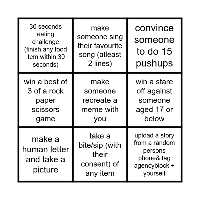 This bingo card has 9 words: make a human letter and take a picture, convince someone to do 15 pushups, make someone sing their favourite song (atleast 2 lines), win a best of 3 of a rock paper scissors game, 30 seconds eating challenge (finish any food item within 30 seconds), win a stare off against someone aged 17 or below, make someone recreate a meme with you, upload a story from a random persons phone& tag agencyblock + yourself and take a bite/sip (with their consent) of any item.