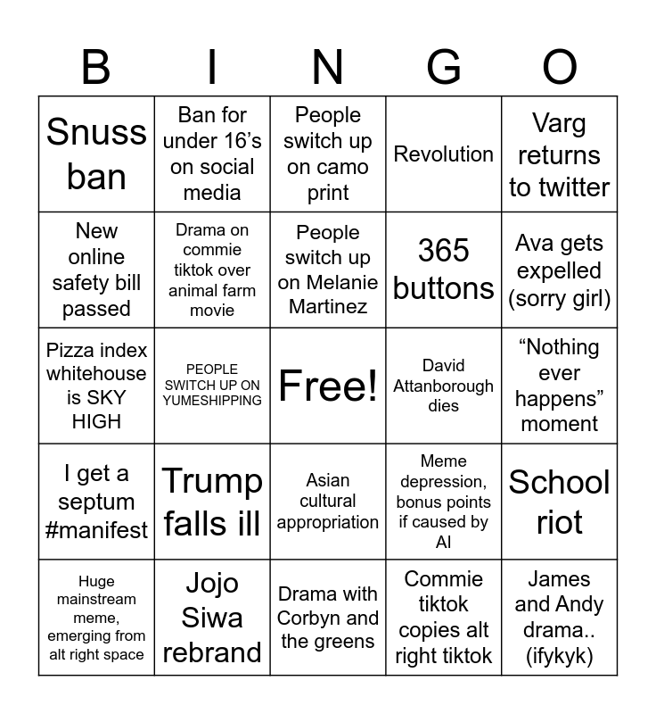 This bingo card has a free space and 24 words: Trump falls ill, Jojo Siwa rebrand, People switch up on Melanie Martinez, Huge mainstream meme, emerging from alt right space, Varg returns to twitter, Snuss ban, New online safety bill passed, Ban for under 16’s on social media, David Attanborough dies, Asian cultural appropriation, 365 buttons, Pizza index whitehouse is SKY HIGH, Meme depression, bonus points if caused by AI, School riot, Drama on commie tiktok over animal farm movie, Commie tiktok copies alt right tiktok, “Nothing ever happens” moment, People switch up on camo print, Ava gets expelled (sorry girl), PEOPLE SWITCH UP ON YUMESHIPPING, James and Andy drama.. (ifykyk), I get a septum #manifest, Revolution and Drama with Corbyn and the greens.