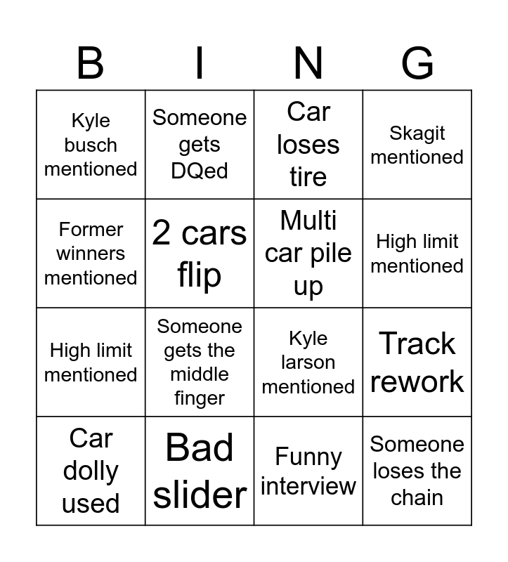 This bingo card has 24 words: Free!, Chili bowl mentioned, High limit mentioned, World Of Outlaws mentioned, Former winners mentioned, Kyle busch mentioned, 2 cars flip, Someone gets DQed, Bad slider, Fight, High limit mentioned, Kyle larson mentioned, World Of Outlaws mentioned, 2 cars flip, Multi car pile up, Former winner mentioned, Funny interview, Car loses tire, Someone gets the middle finger, Track rework, Car dolly used, Someone loses the chain, Skagit mentioned and Flat tire.