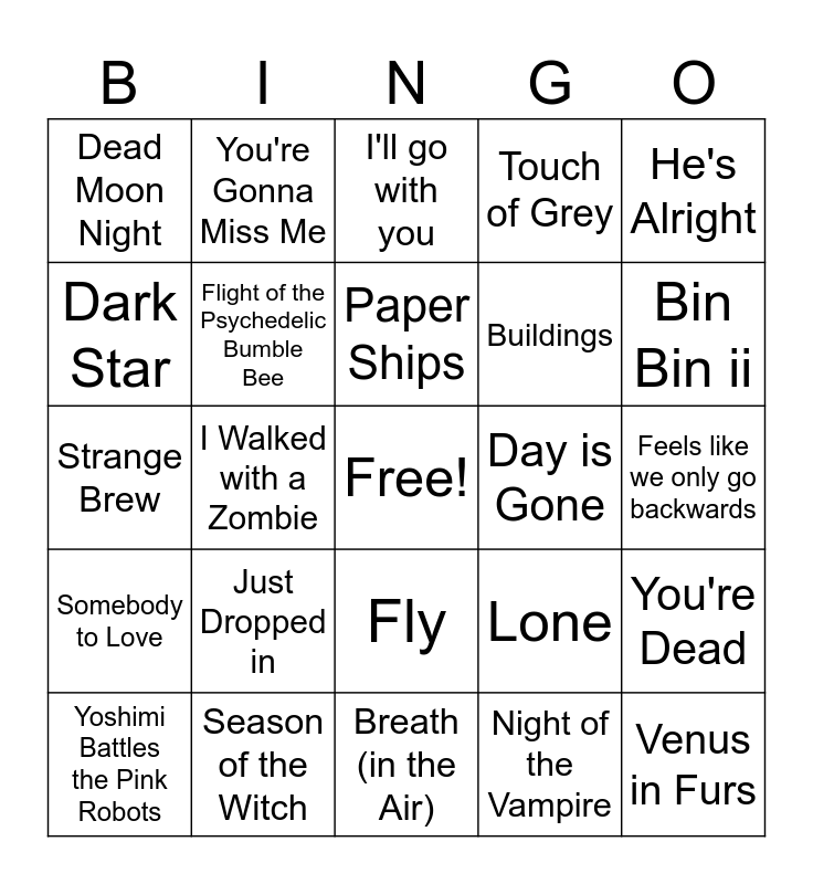 This bingo card has a free space and 50 words: Time of the Season, Venus in Furs, White Rabbit, Breath (in the Air), Just Dropped in, Crimson and Clover, You're Gonna Miss Me, Incense and Peppermints, Dark Star, Rainy Day Mushroom Pillow, Flight of the Psychedelic Bumble Bee, Touch of Grey, You're Dead, Lone, Road, Embryonic journey, Paper Ships, Day is Gone, Onie, He's Alright, I Walked with a Zombie, Night of the Vampire, Dead Moon Night, Buildings, The Ballet, What is ashwasganda, Bin Bin ii, Death comes from the sky, I'll go with you, Fly, Snowman, Anemone, She's Not There, You Keep Me Hangin On, Season of the Witch, Summertime, Hurdy Gurdy Man, Comfortably Numb, Planet Caravan, Feels like we only go backwards, Black Lagoon, Marinade, Fingertips, She Don't Use Jelly, Yoshimi Battles the Pink Robots, Strange Brew, I'd Love To Change The World, Dry Rain, Somebody to Love and Always See Your Face.