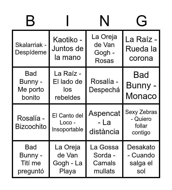 This bingo card has 61 words: Free!, Desakato - La ira de los hambrientos, Desakato - Cada vez, Desakato - Cuando salga el sol, Desakato - Animales hambrientos, Rosalía - Malamente, Rosalía - Despechá, Rosalía - Saoko, Rosalía - Bizcochito, La Raíz - A la sombra de la sierra, La Raíz - Rueda la corona, La Raíz - Entre poetas y presos, La Raíz - El lado de los rebeldes, Skalarriak - Skalari Rude Club, Skalarriak - Solo vivir, Skalarriak - Despídeme, Bad Bunny - Tití me preguntó, Bad Bunny - Me porto bonito, Bad Bunny - Moscow Mule, Bad Bunny - Monaco, La Oreja de Van Gogh - La Playa, La Oreja de Van Gogh - Rosas, La Oreja de Van Gogh - 20 de enero, La Oreja de Van Gogh - Puedes contar conmigo, La Oreja de Van Gogh - Cuídate, El Canto del Loco - Zapatillas, El Canto del Loco - Besos, El Canto del Loco - Peter Pan, El Canto del Loco - Insoportable, Leiva - Terriblemente cruel, Leiva - Lady Madrid, Leiva - No te preocupes por mí, Kaotiko - Otra noche, Kaotiko - Preso 2023, Kaotiko - Juntos de la mano, Sexy Zebras - Jaleo, Sexy Zebras - Tonterías, Sexy Zebras - Quiero follar contigo, Non Servium - Animal, Aspencat - La distància, Aspencat - Música naix de la ràbia, Aspencat - Quan caminàvem, La Gossa Sorda - Camals mullats, La Gossa Sorda - Esbarzers, La Gossa Sorda - Quina calitja, Segismundo Toxicómano - Las noches que no duermo, Segismundo Toxicómano - Por ti, Segismundo Toxicómano - Mi vida, Marea - El perro verde, Marea - Que se joda el viento, Marea - En tu agujero, Pignoise - Nada que perder, Pignoise - Te entiendo, Pignoise - Estoy enfermo, Obrint Pas - La flama, Obrint Pas - Benvingut al paradís, Obrint Pas - Viure, Natos y Waor - Cicatrices, Natos y Waor - Rocknrolla, Natos y Waor - Generación perdida and Los Policos - Galgo.