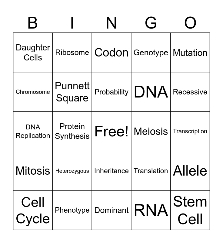 This bingo card has a free space and 28 words: Allele, Gene, DNA, RNA, Chromosome, Codon, Ribosome, Mitosis, Meiosis, Cell Cycle, DNA Replication, Genotype, Phenotype, Dominant, Recessive, Homozygous, Heterozygous, Punnett Square, Probability, Inheritance, Daughter Cells, Differentiation, Stem Cell, Protein Synthesis, Transcription, Translation, Mutation and Cancer.