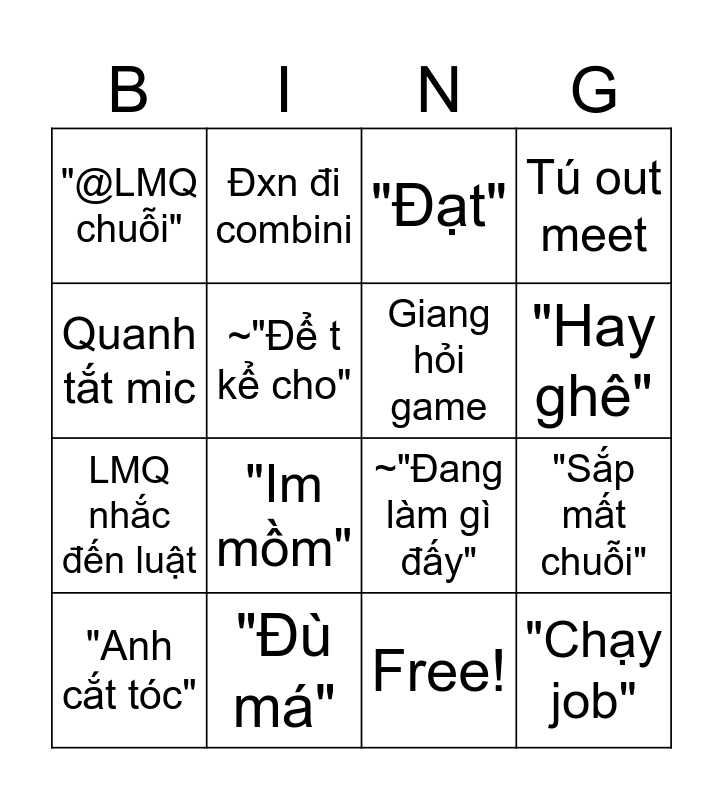 This bingo card has 17 words: Free!, "Anh cắt tóc", "Đạt", "@LMQ chuỗi", "Im mồm", Tú out meet, "Sắp mất chuỗi", Giang hỏi game, "Hay ghê", ~"Để t kể cho", "Đù má", ~"Đang làm gì đấy", Quanh tắt mic, Đxn đi combini, LMQ nhắc đến luật, Giang nhắc đến Lùn and "Chạy job".