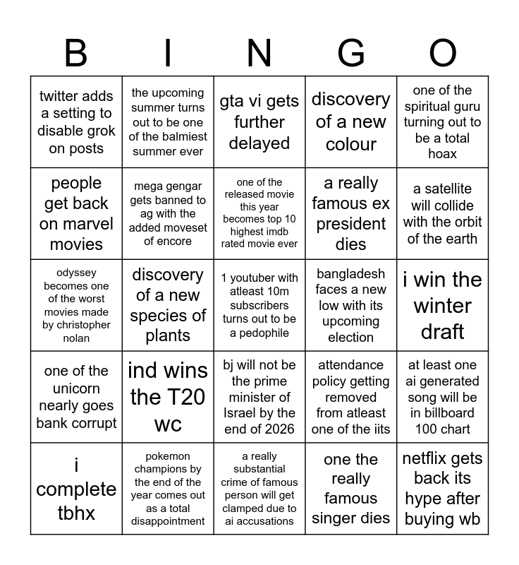 This bingo card has a free space and 24 words: ind wins the T20 wc, pokemon champions by the end of the year comes out as a total disappointment, one of the released movie this year becomes top 10 highest imdb rated movie ever, i complete tbhx, one of the spiritual guru turning out to be a total hoax, twitter adds a setting to disable grok on posts, people get back on marvel movies, the upcoming summer turns out to be one of the balmiest summer ever, bangladesh faces a new low with its upcoming election, bj will not be the prime minister of Israel by the end of 2026, a really famous ex president dies, odyssey becomes one of the worst movies made by christopher nolan, attendance policy getting removed from atleast one of the iits, at least one ai generated song will be in billboard 100 chart, mega gengar gets banned to ag with the added moveset of encore, one the really famous singer dies, i win the winter draft, gta vi gets further delayed, a satellite will collide with the orbit of the earth, discovery of a new species of plants, netflix gets back its hype after buying wb, one of the unicorn nearly goes bank corrupt, discovery of a new colour and a really substantial crime of famous person will get clamped due to ai accusations.