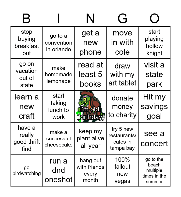 This bingo card has a free space and 24 words: make a successful cheesecake, run a dnd oneshot, read at least 5 books, go birdwatching, start playing hollow knight, stop buying breakfast out, go on vacation out of state, go to a convention in orlando, donate money to charity, keep my plant alive all year, draw with my art tablet, learn a new craft, try 5 new restaurants/ cafes in tampa bay, see a concert, make homemade lemonade, 100% fallout new vegas, Hit my savings goal, get a new phone, visit a state park, start taking lunch to work, go to the beach multiple times in the summer, have a really good thrift find, move in with cole and hang out with friends every month.