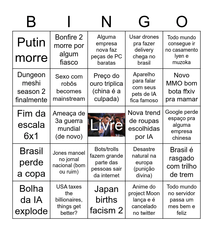 This bingo card has a free space and 24 words: Jones manoel no jornal nacional (bom ou ruim), USA taxes the billionaires, things get better?, Preço do ouro triplica (china é a culpada), Bolha da IA explode, Todo mundo consegue ir no casamento lyen e muzoka, Putin morre, Dungeon meshi season 2 finalmente, Bonfire 2 morre por algum fiasco, Nova trend de roupas escolhidas por IA, Bots/trolls fazem grande parte das pessoas sair da internet, Aparelho para falar com seus pets de IA fica famoso, Fim da escala 6x1, Desastre natural na europa (punição divina), Brasil é rasgado com trilho de trem, Sexo com robôs becomes mainstream, Anime do project Moon lança e é cancelado no twitter, Google perde espaço pra alguma empresa chinesa, Alguma empresa nova faz peças de PC baratas, Novo MMO bom bota ffxiv pra mamar, Ameaça de 3a guerra mundial (de novo), Todo mundo no servidor passa um mes bem e feliz, Brasil perde a copa, Usar drones pra fazer delivery chega no brasil and Japan births facism 2.