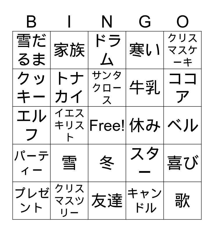 This bingo card has a free space and 24 words: 雪, クリスマスツリー, サンタクロース, プレゼント, クリスマスケーキ, 雪だるま, クッキー, 家族, 休み, 冬, 牛乳, エルフ, スター, 喜び, トナカイ, キャンドル, ベル, ドラム, ココア, イエスキリスト, 歌, パーティー, 寒い and 友達.