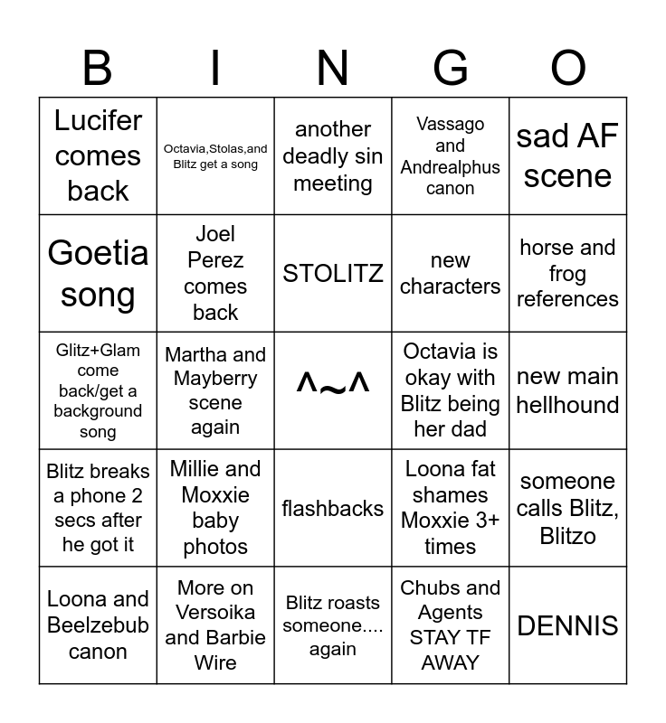 This bingo card has a free space and 24 words: Millie and Moxxie baby photos, More on Versoika and Barbie Wire, STOLITZ, Loona and Beelzebub canon, sad AF scene, Lucifer comes back, Goetia song, Octavia,Stolas,and Blitz get a song, Octavia is okay with Blitz being her dad, flashbacks, new characters, Glitz+Glam come back/get a background song, Loona fat shames Moxxie 3+ times, someone calls Blitz, Blitzo, Joel Perez comes back, Chubs and Agents STAY TF AWAY, new main hellhound, another deadly sin meeting, horse and frog references, Martha and Mayberry scene again, DENNIS, Blitz breaks a phone 2 secs after he got it, Vassago and Andrealphus canon and Blitz roasts someone.... again.