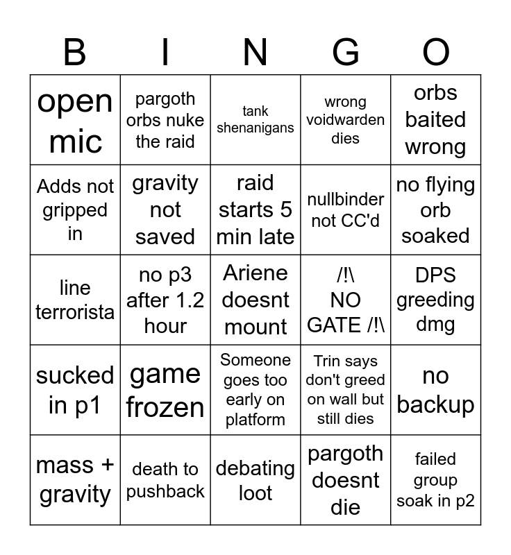 This bingo card has a free space and 24 words: game frozen, death to pushback, raid starts 5 min late, mass + gravity, orbs baited wrong, open mic, Adds not gripped in, pargoth orbs nuke the raid, /!\ NO GATE /!\, Someone goes too early on platform, nullbinder not CC'd, line terrorista, Trin says don't greed on wall but still dies, no backup, gravity not saved, pargoth doesnt die, DPS greeding dmg, tank shenanigans, no flying orb soaked, no p3 after 1.2 hour, failed group soak in p2, sucked in p1, wrong voidwarden dies and debating loot.