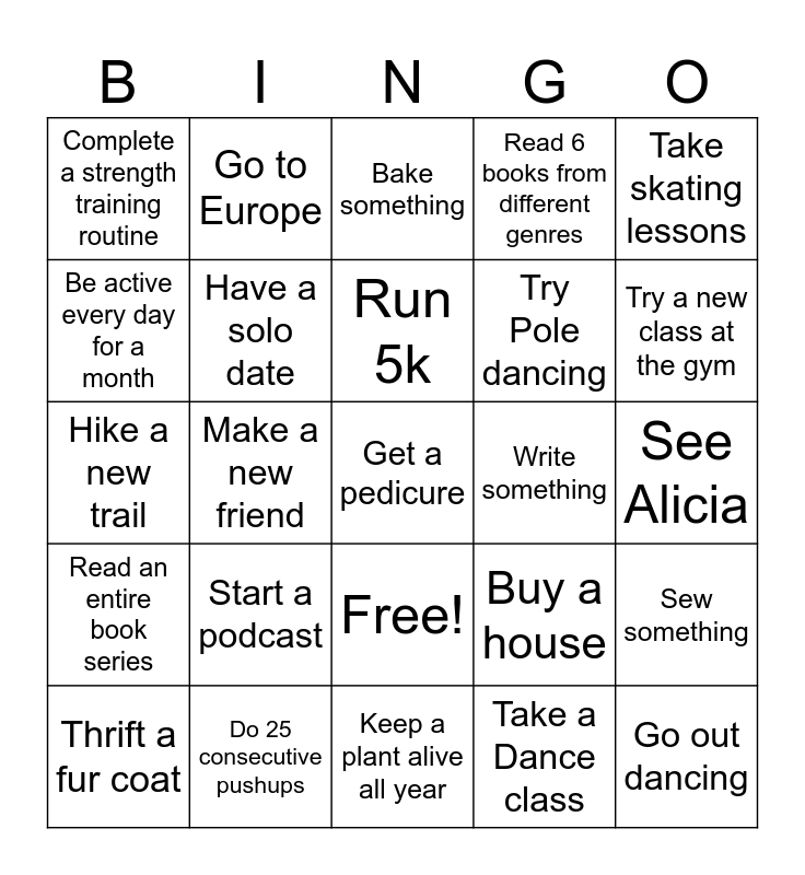 This bingo card has 26 words: Free!, Take a Dance class, Run 5k, Do 25 consecutive pushups, Take skating lessons, Complete a strength training routine, Be active every day for a month, Go to Europe, See Alicia, Buy a house, Try Pole dancing, Hike a new trail, Sew something, Thrift a fur coat, Make a new friend, Win at bingo, Read 6 books from different genres, Read an entire book series, Bake something, Get a pedicure, Try a new class at the gym, Keep a plant alive all year, Write something, Start a podcast, Have a solo date and Go out dancing.
