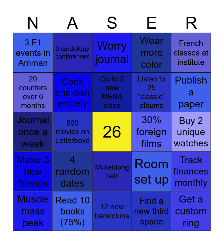 This bingo card has a free space and 24 words: 4 random dates, Read 10 books (75%), Go to 2 new MENA cities, Muscle mass peak, French classes at institute, 3 F1 events in Amman, 20 counters over 6 months, 3 cardiology conferences, 30% foreign films, Mullet/long hair, Listen to 25 “classic” albums, Journal once a week, Room set up, Track finances monthly, Cook one dish entirely, Find a new third space, Buy 2 unique watches, Worry journal, Publish a paper, 500 movies on Letterboxd, Get a custom ring, Make 3 new friends, Wear more color and 12 new bars/clubs.