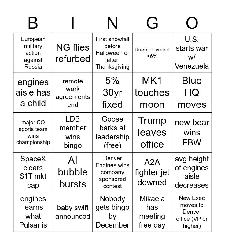 This bingo card has a free space and 24 words: AI bubble bursts, baby swift announced, 5% 30yr fixed, engines learns what Pulsar is, U.S. starts war w/ Venezuela, European military action against Russia, engines aisle has a child, NG flies refurbed, Trump leaves office, Denver Engines wins company sponsored contest, MK1 touches moon, major CO sports team wins championship, A2A fighter jet downed, avg height of engines aisle decreases, remote work agreements end, Mikaela has meeting free day, new bear wins FBW, First snowfall before Halloween or after Thanksgiving, Blue HQ moves, LDB member wins bingo, New Exec moves to Denver office (VP or higher), SpaceX clears $1T mkt cap, Unemployment <6% and Nobody gets bingo by December.