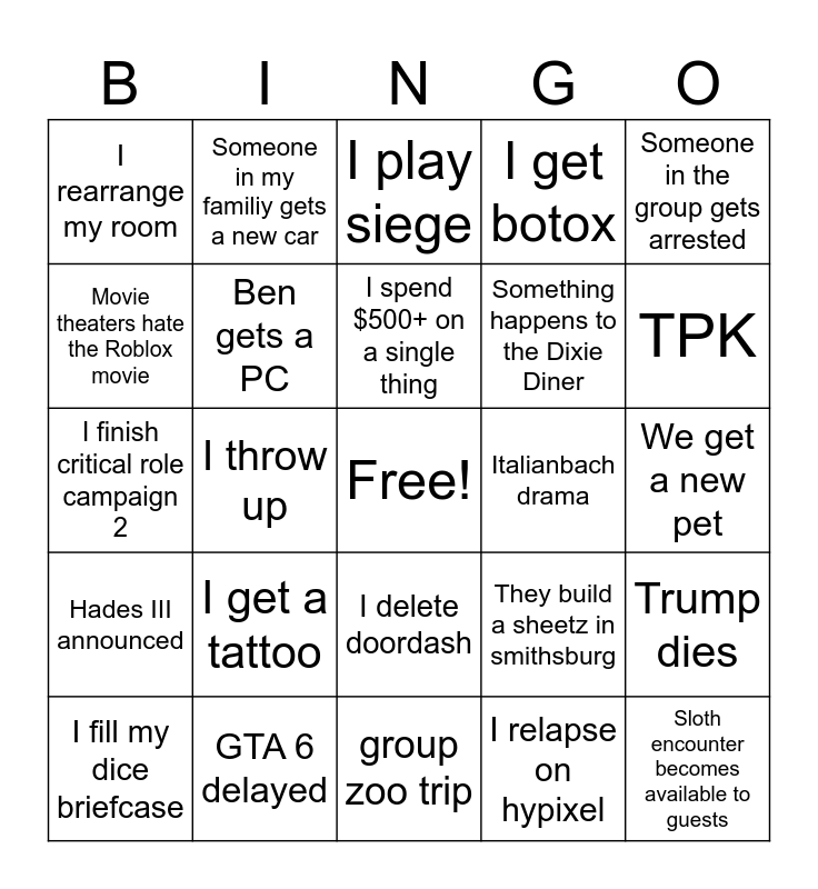 This bingo card has a free space and 24 words: I get a tattoo, GTA 6 delayed, I spend $500+ on a single thing, I fill my dice briefcase, Someone in the group gets arrested, I rearrange my room, Movie theaters hate the Roblox movie, Someone in my familiy gets a new car, Italianbach drama, I delete doordash, Something happens to the Dixie Diner, I finish critical role campaign 2, They build a sheetz in smithsburg, Trump dies, Ben gets a PC, I relapse on hypixel, We get a new pet, I play siege, TPK, I throw up, Sloth encounter becomes available to guests, Hades III announced, I get botox and group zoo trip.