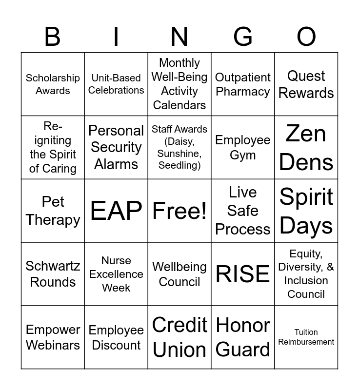 This bingo card has a free space and 24 words: Nurse Excellence Week, Employee Discount, Staff Awards (Daisy, Sunshine, Seedling), Empower Webinars, Quest Rewards, Scholarship Awards, Re-igniting the Spirit of Caring, Unit-Based Celebrations, Live Safe Process, Wellbeing Council, Employee Gym, Pet Therapy, RISE, Equity, Diversity, & Inclusion Council, Personal Security Alarms, Honor Guard, Spirit Days, Monthly Well-Being Activity Calendars, Zen Dens, EAP, Tuition Reimbursement, Schwartz Rounds, Outpatient Pharmacy and Credit Union.
