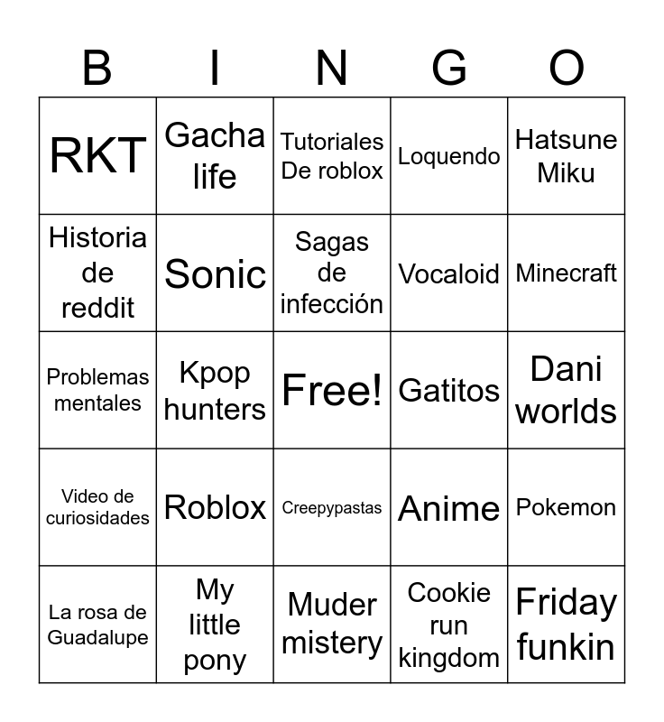 This bingo card has a free space and 24 words: Roblox, My little pony, Sagas de infección, La rosa de Guadalupe, Hatsune Miku, RKT, Historia de reddit, Gacha life, Gatitos, Creepypastas, Vocaloid, Problemas mentales, Anime, Pokemon, Sonic, Cookie run kingdom, Dani worlds, Tutoriales De roblox, Minecraft, Kpop hunters, Friday funkin, Video de curiosidades, Loquendo and Muder mistery.