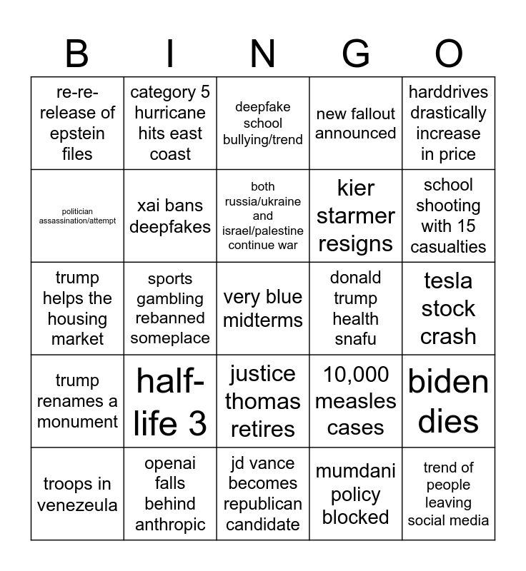 This bingo card has a free space and 24 words: half-life 3, openai falls behind anthropic, both russia/ukraine and israel/palestine continue war, troops in venezeula, harddrives drastically increase in price, re-re-release of epstein files, politician assassination/attempt, category 5 hurricane hits east coast, donald trump health snafu, justice thomas retires, kier starmer resigns, trump helps the housing market, 10,000 measles cases, biden dies, xai bans deepfakes, mumdani policy blocked, tesla stock crash, deepfake school bullying/trend, school shooting with 15 casualties, sports gambling rebanned someplace, trend of people leaving social media, trump renames a monument, new fallout announced and jd vance becomes republican candidate.
