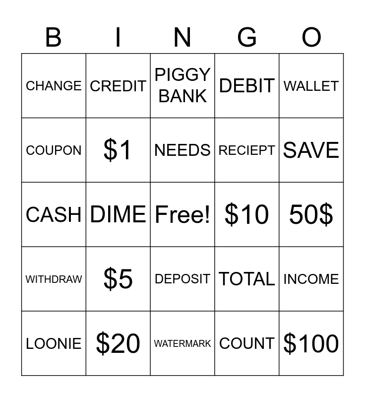 This bingo card has a free space and 29 words: LOONIE, NICKEL, DIME, QUARTER, CHANGE, PIGGY BANK, $1, $5, $10, $20, 50$, $100, WATERMARK, COUNT, SAVE, SPEND, DEPOSIT, WITHDRAW, WALLET, CASH, TOTAL, PRICE, RECIEPT, COUPON, DEBIT, CREDIT, INCOME, NEEDS and WANTS.