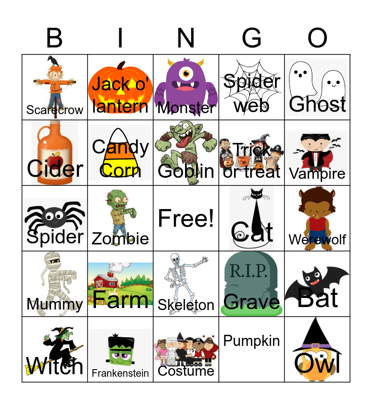 This bingo card has 24 images, a free space and 25 words: Farm, Costume, Goblin, Witch, Ghost, Scarecrow, Cider, Jack o' lantern, Cat, Skeleton, Trick or treat, Spider, Grave, Bat, Candy Corn, Leaves, Werewolf, Monster, Vampire, Zombie, Owl, Frankenstein, Mummy, Spider web and Pumpkin.