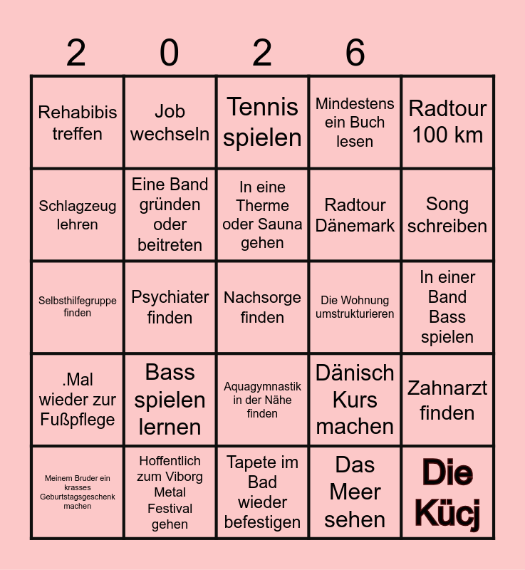 This bingo card has 25 words: Bass spielen lernen, Tapete im Bad wieder befestigen, In eine Therme oder Sauna gehen, Meinem Bruder ein krasses Geburtstagsgeschenk machen, Radtour 100 km, Rehabibis treffen, Schlagzeug lehren, Job wechseln, Die Wohnung umstrukturieren, Aquagymnastik in der Nähe finden, Radtour Dänemark, Selbsthilfegruppe finden, Dänisch Kurs machen, Zahnarzt finden, Eine Band gründen oder beitreten, Die Kücj, In einer Band Bass spielen, Tennis spielen, Song schreiben, Psychiater finden, Nachsorge finden, Hoffentlich zum Viborg Metal Festival gehen, .Mal wieder zur Fußpflege, Mindestens ein Buch lesen and Das Meer sehen.