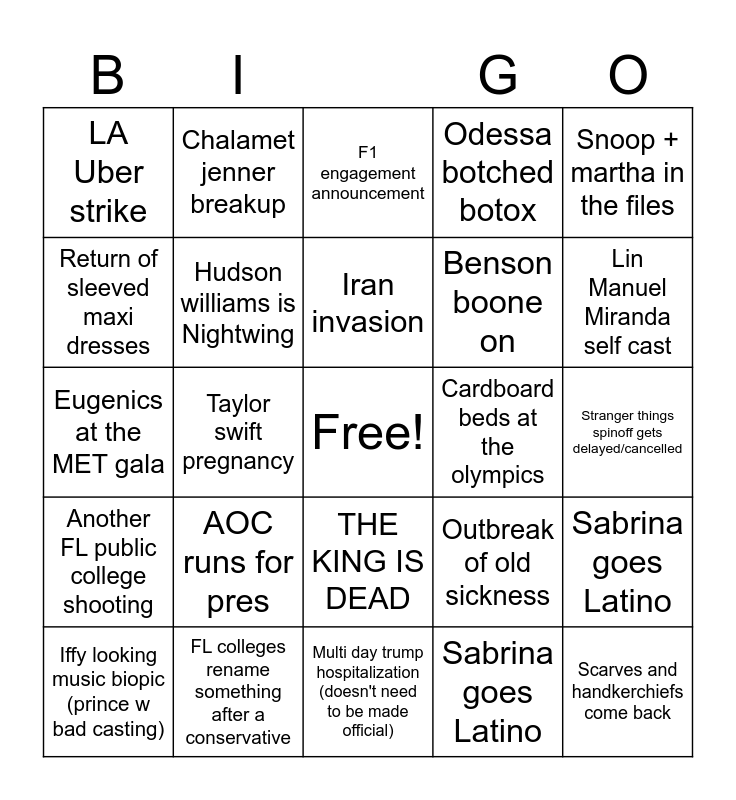 This bingo card has a free space and 28 words: Sabrina goes Latino, Hudson williams is nightwing, Benson boone on, Sabrina goes Latino, Return of sleeved maxi dresses, F1 engagement announcement, Chalamet jenner breakup, Another FL public college shooting, Cardboard beds at the olympics, Iffy looking music biopic (prince w bad casting), Eugenics at the MET gala, Odessa botched botox, FL colleges rename something after a conservative, Multi day trump hospitalization (doesn't need to be made official), Lin Manuel Miranda self cast, FREE (mamdani goes viral again), AOC runs for pres, Hudson williams is Nightwing, Iran invasion, THE KING IS DEAD, LA Uber strike, Anti intellectual misappropriation of classic literature (not counting wuthering heights), Scarves and handkerchiefs come back, Taylor swift pregnancy, Stranger things spinoff gets delayed/cancelled, Outbreak of old sickness, Snoop + martha in the files and Benson boone is on DWTS.