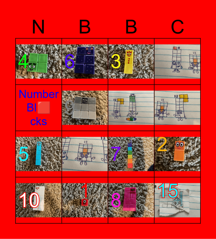 This bingo card has 15 images and 12 words: 1, 2, 3, 4, 5, 6, 7, 8, Number Bl🟥cks, 9, 10 and 15.