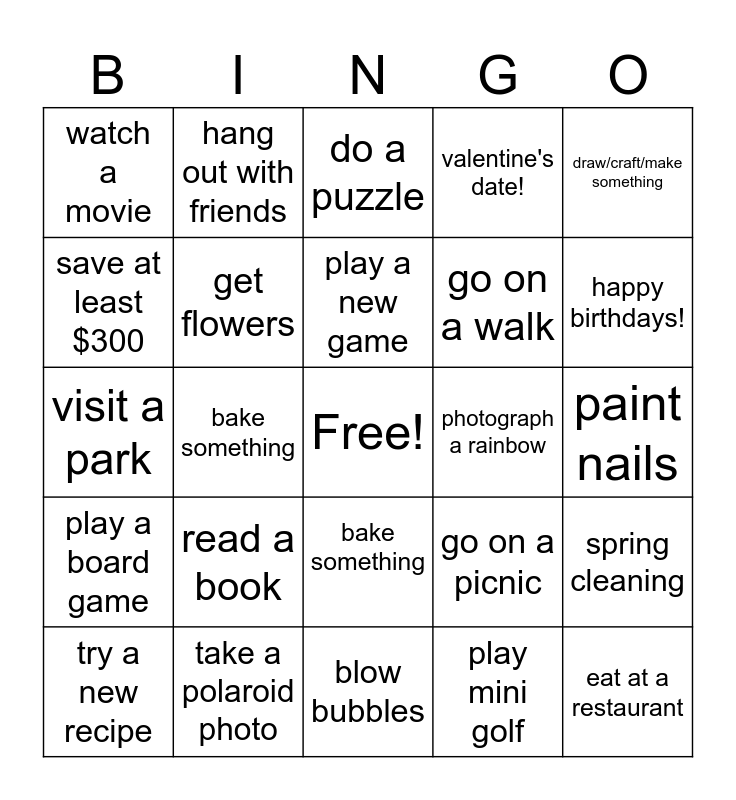This bingo card has a free space and 24 words: read a book, take a polaroid photo, play a new game, try a new recipe, draw/craft/make something, watch a movie, save at least $300, hang out with friends, photograph a rainbow, bake something, go on a walk, visit a park, go on a picnic, spring cleaning, get flowers, play mini golf, paint nails, do a puzzle, happy birthdays!, bake something, eat at a restaurant, play a board game, valentine's date! and blow bubbles.