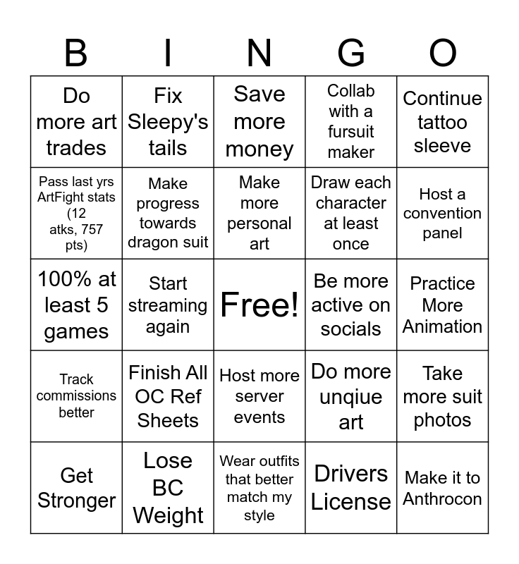 This bingo card has a free space and 24 words: Finish All OC Ref Sheets, Lose BC Weight, Make more personal art, Get Stronger, Continue tattoo sleeve, Do more art trades, Pass last yrs ArtFight stats (12 atks, 757 pts), Fix Sleepy's tails, Be more active on socials, Host more server events, Draw each character at least once, 100% at least 5 games, Do more unqiue art, Take more suit photos, Make progress towards dragon suit, Drivers License, Practice More Animation, Save more money, Host a convention panel, Start streaming again, Make it to Anthrocon, Track commissions better, Collab with a fursuit maker and Wear outfits that better match my style.