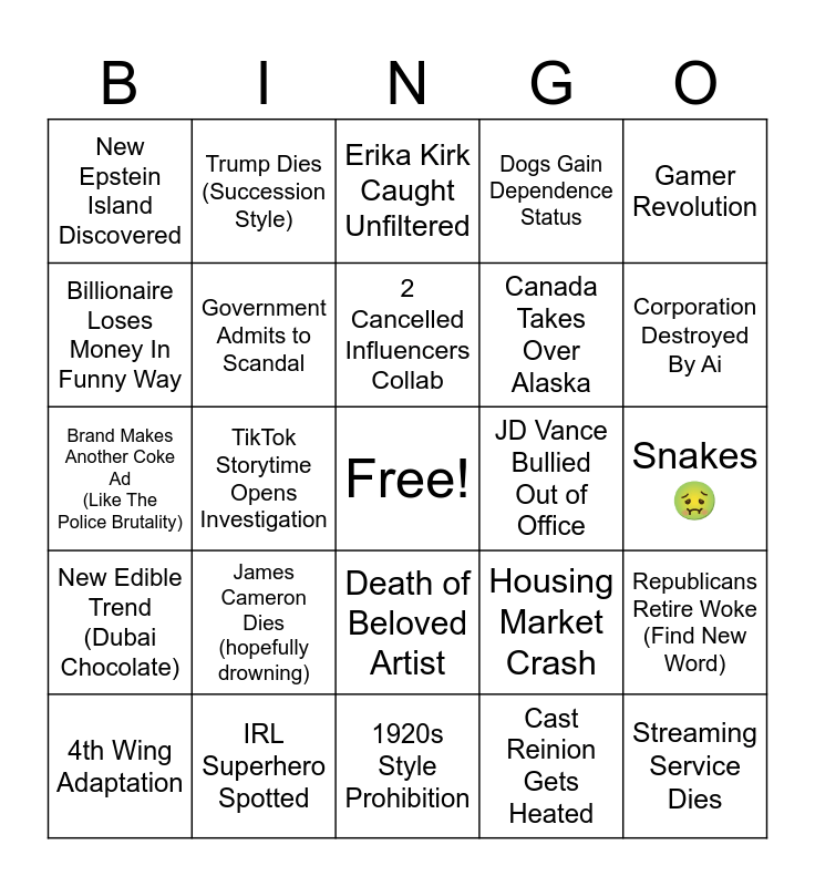 This bingo card has a free space and 24 words: 4th Wing Adaptation, James Cameron Dies (hopefully drowning), 2 Cancelled Influencers Collab, Cast Reinion Gets Heated, Gamer Revolution, New Epstein Island Discovered, Trump Dies (Succession Style), Erika Kirk Caught Unfiltered, JD Vance Bullied Out of Office, Snakes 🤢, Brand Makes Another Coke Ad (Like The Police Brutality), Government Admits to Scandal, Housing Market Crash, Republicans Retire Woke (Find New Word), Billionaire Loses Money In Funny Way, IRL Superhero Spotted, 1920s Style Prohibition, Dogs Gain Dependence Status, Corporation Destroyed By Ai, New Edible Trend (Dubai Chocolate), TikTok Storytime Opens Investigation, Death of Beloved Artist, Canada Takes Over Alaska and Streaming Service Dies.